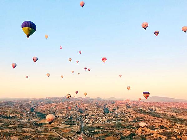 緩緩升起的熱氣球,映入眼簾的是無限壯觀奇岩美景,更精彩的是上百顆的熱氣球同時間升空(聽說一天最多只能同時飛100顆),原本已經很美的自然景色,加上滿布天空的熱氣球,當下的那個畫面,美到一生都忘不了。在土耳其的十天內,這60分鐘是我最不想要結束的60分鐘。因為60分鐘結束後,1小時就過去了...