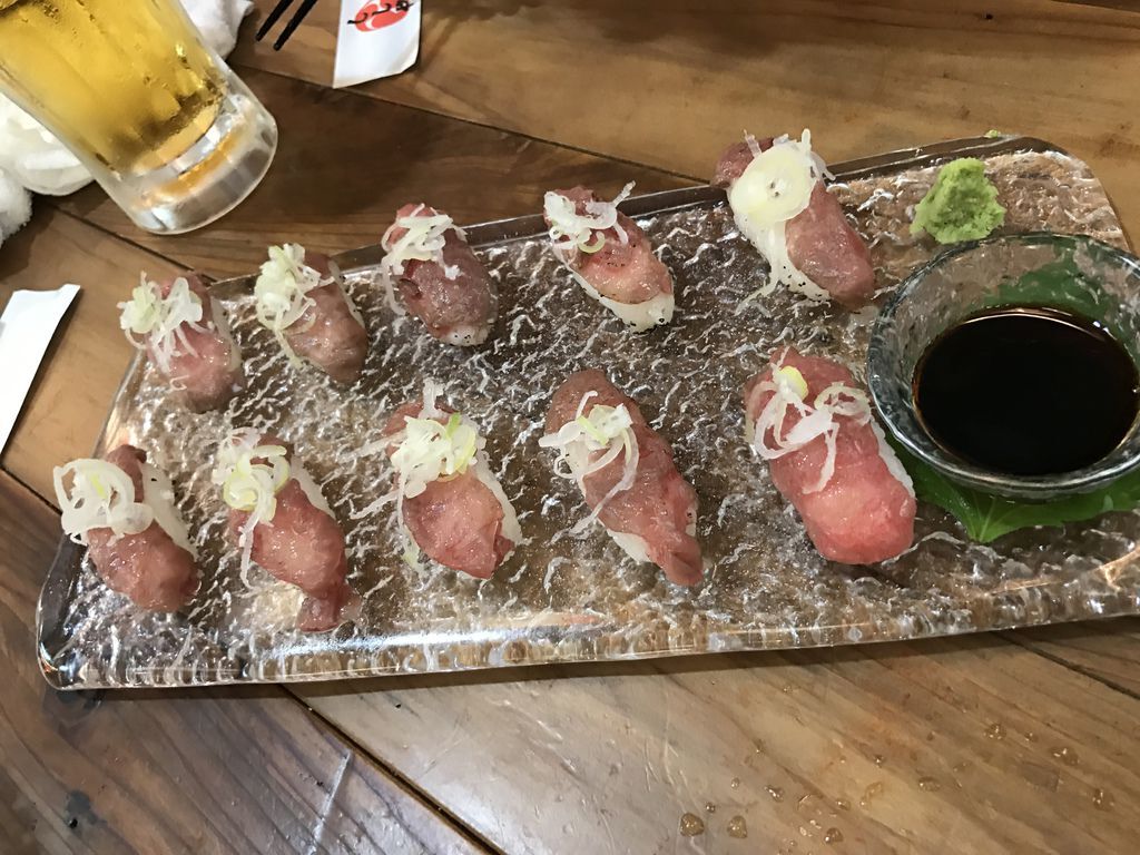 這個一樣不推不行,稍微炙燒過讓些微的和牛油脂滲透到飯裡,一口吃下,醋飯跟和牛就是完美的結合。菜單上也有牛舌握壽司,我推薦點霜降和牛握壽司,因為和牛的舌頭跟美國牛其實差異比較不大。如果你沒吃過當然也可以點來試試看喔。這道必點!!