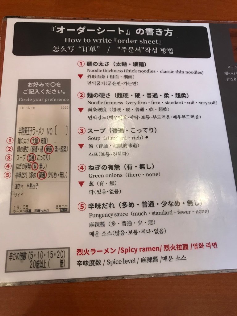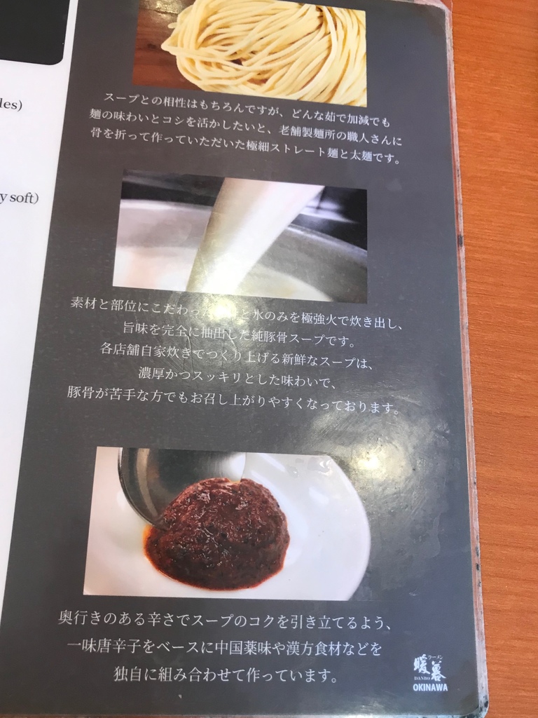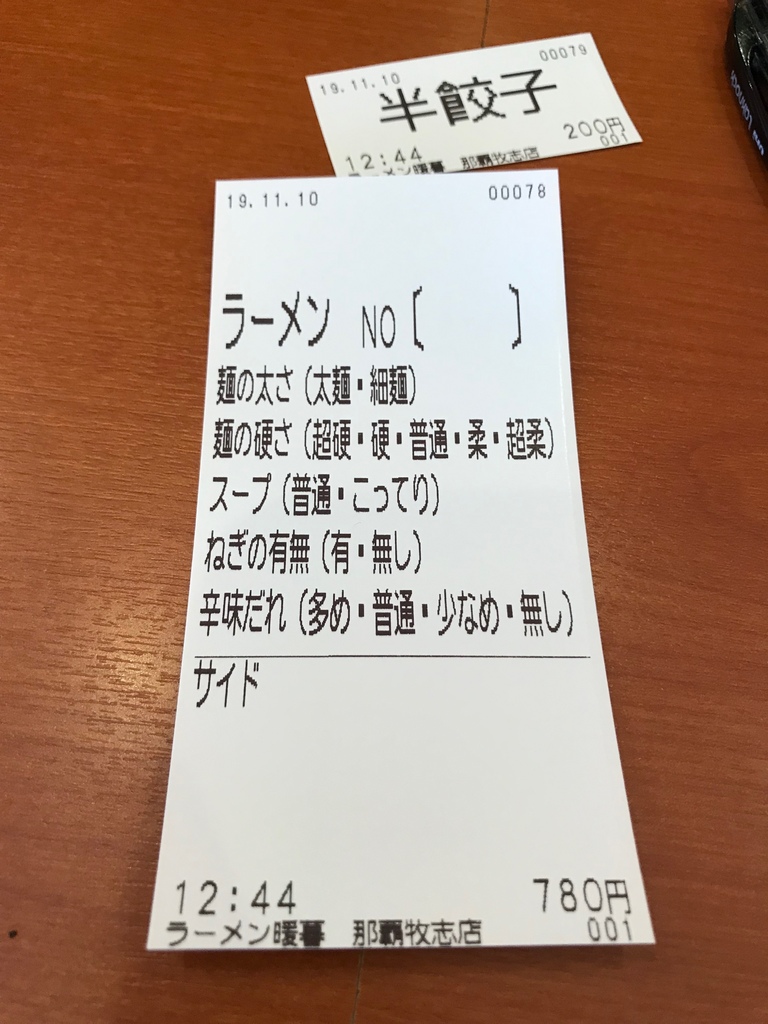 在你的座位上會有拉麵口味、麵條的選擇,跟一蘭一樣,那店員也會給你中文翻譯的對照,所以不用怕看不懂,基本上我都是選擇普通或推薦,對我來說沖繩的拉麵都不會很鹹,但我朋友卻有人說很鹹,果然口味真的看個人,這次我朋友一致覺得暖暮比一蘭好吃。寫完後交給店員就可以了。