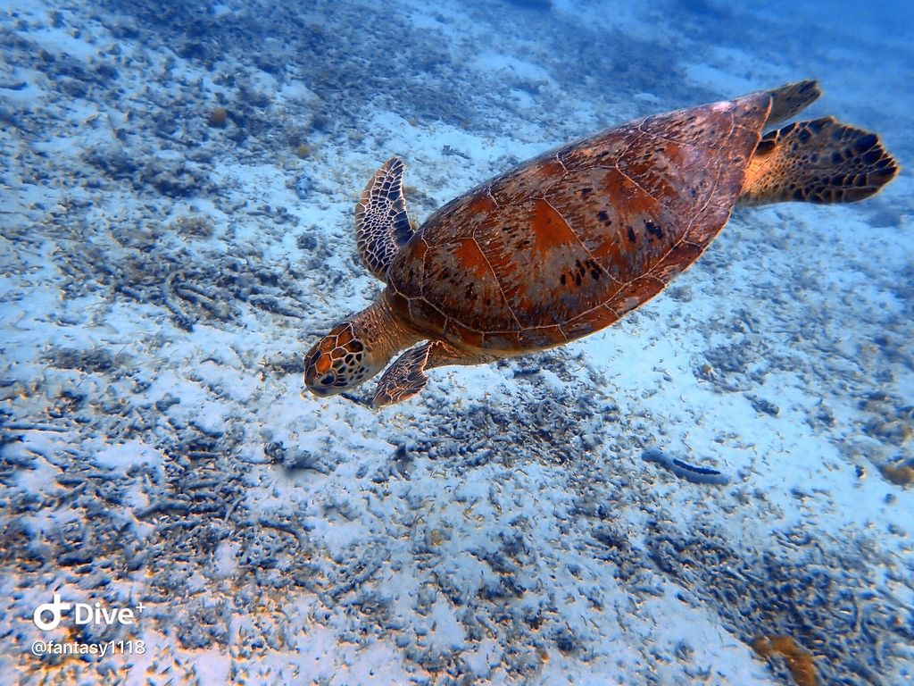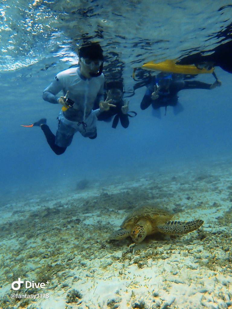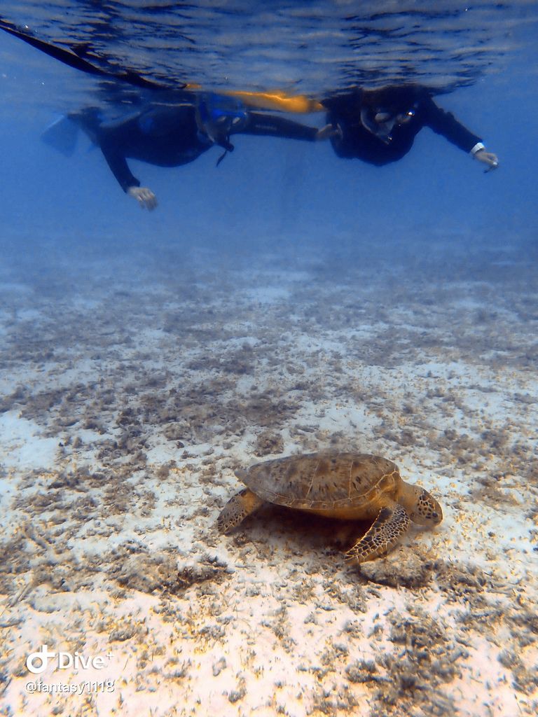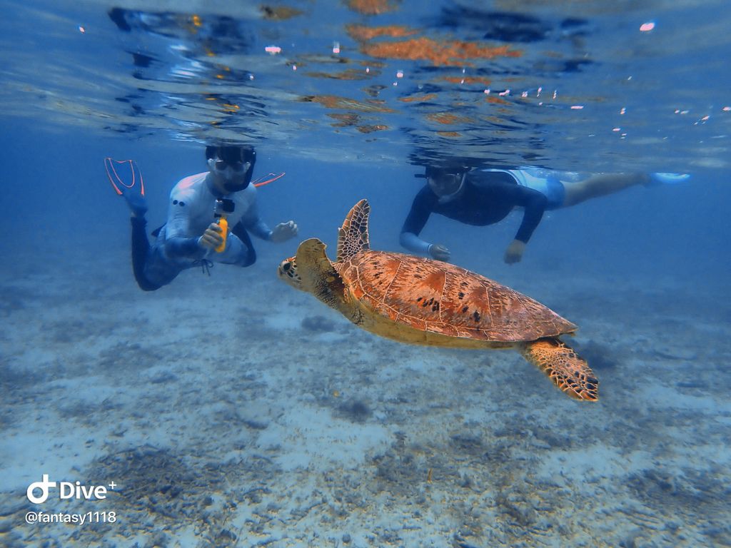 那我們回到一開始浮潛的部分,水真的超級無敵冷的,游沒多久就馬上看到了海龜。在這裡我覺得有個不錯的地方就是沖繩不會強迫你穿救生衣,你會游泳的話就能直接下潛去拍照,不像小琉球一定要穿救生衣,只差在我的技術還不夠好,回台灣後我要繼續練我的自由潛水。