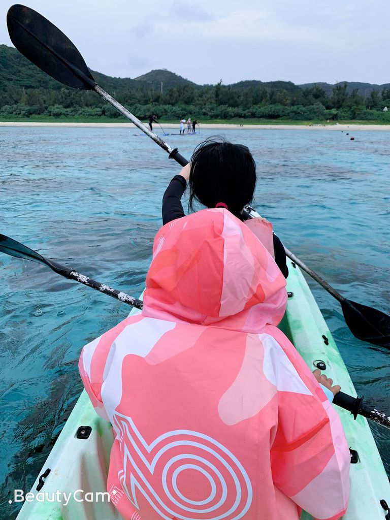 回去的海流特別強,站著划都划不動,這時候就跪著划,動力可以加倍喔。獨木舟少女組遇到了困難,都划不太回去,上岸時他們都說快累死了。