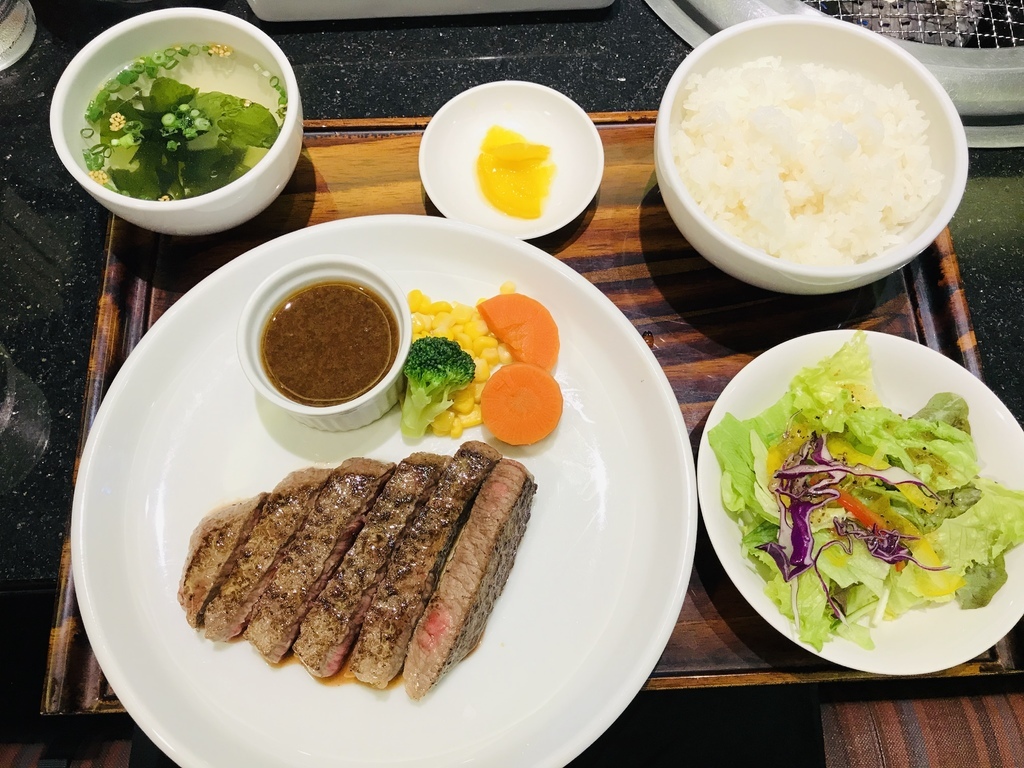 這牛排熟度煎得剛剛好,軟嫩多汁,搭配旁邊附的肉汁一起配飯吃,也太美味了吧!吃起來也太爽,日本的飯煮得真的很Q,真想再來塊牛排呀!下次再來我一定要試試最高級的菲力牛排。