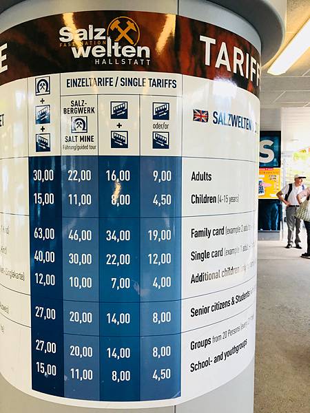 另外可以看到他有賣單程的纜車,你一定會問誰會只坐單程呀?這是因為從哈修塔特小鎮有一條山路可以通到天空步道觀景台,所以如果你在冬天纜車沒開放的時候,你也可以自己走山路上去看風景的。或是也可以坐車上山走路下山,看你自己的選擇囉。