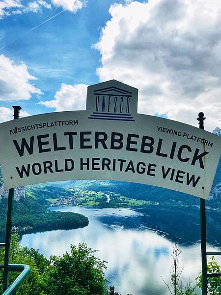 一看到好天氣我當然也是先往觀景台去了,可以看到牌子上的世界遺產景色,站到最角落真的是美呆了,大家都在輪流拍照呢!往下看也可以看到整個小鎮跟湖景,雖然沒五指山那麼高,但真的很漂亮。